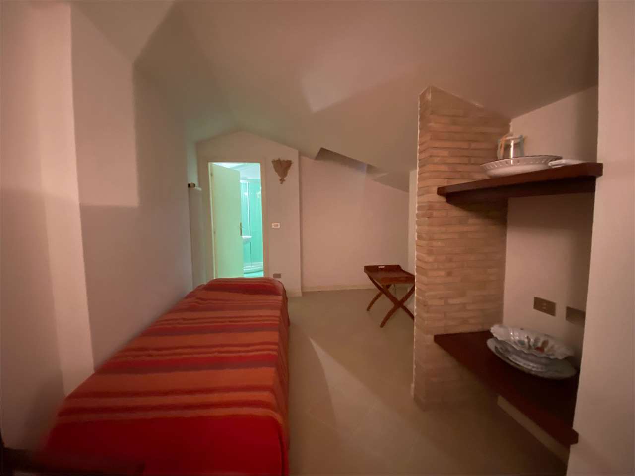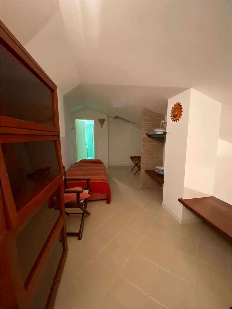 Composizione: soggiorno con angolo cottura, terrazzo di 10 mq, perfetto per pranzi all’aperto, armadio a muro nel disimpegno, bagno finestrato, tre camere da letto, di cui due in mansarda con travi a vista