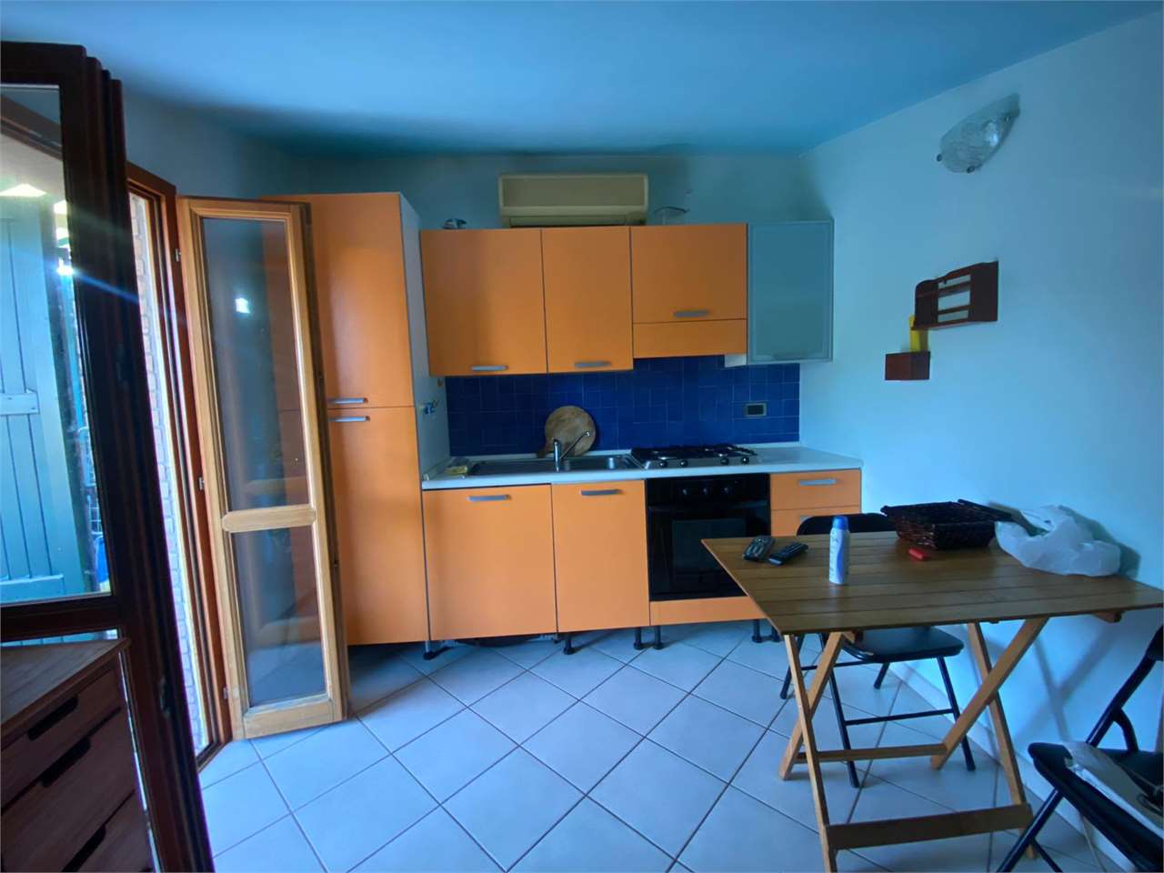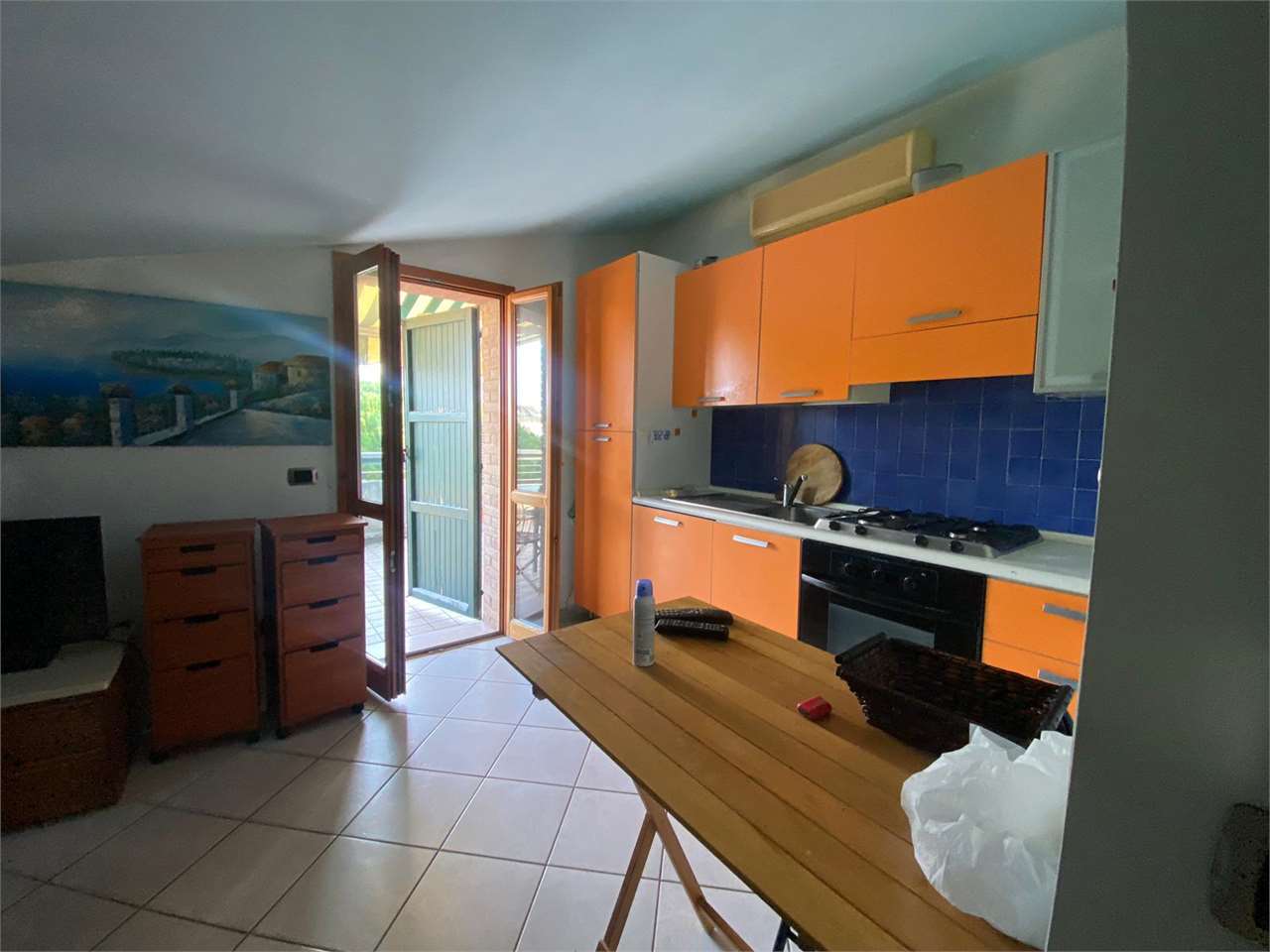 All’interno si presenta come un ambiente unico: zona giorno con angolo cottura, area pranzo e salotto con TV, mentre la zona notte si trova nella parte mansardata dello stesso open space. Il bagno è dotato di box doccia.