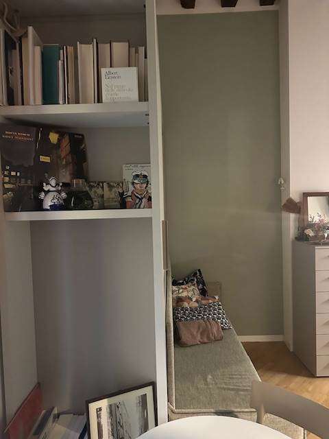 Zona Notte: Un’area intima e raccolta, con da una libreria di design che funge da elemento d’arredo .